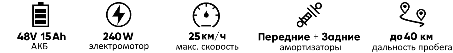 • • Мощность и энергоэффективность: оснащен двигателем мощностью 240 Вт и пиковым показателем 500 Вт, что обеспечивает отличную динамику и уверенность на дороге.